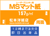 | MSマット紙レーザープリンター用のツヤ消しのマット紙(両面)です。つや消し、マット感のある落ち着いた印象です。 社内パンフ・商品紹介・ハガキなどの印刷を社内でスピーディーにすることができます。 【レーザープリンター用紙印刷方法】 厚手の紙やシールをご使用の場合は、用紙設定を厚紙などに変更してご使用ください。 通常のコピー用紙(普通紙設定)のままではトナーの定着温度が低いため、完全に定着しない場合がございます。■厚み : 0.17mm(170μm)■枚数 : 500枚■サイズ : A3ノビ(328mm×453mm)■坪数 : 157g/m2■出荷予定:昼12時まで注文分即日出荷断裁加工賃(カット判の加工)一方向 1,000円(税別)MSマット紙 157.0g/平米 B5サイズ:2000枚価格 8800円(税別) MSマット紙 157.0g/平米 B5サイズ:1000枚価格 6600円(税別) MSマット紙 157.0g/平米 B5サイズ:500枚価格 3900円(税別) MSマット紙 127.9g/平米 B5サイズ:2000枚価格 7700円(税別) MSマット紙 104.7g/平米 B5サイズ:2000枚価格 6600円(税別) MSマット紙 104.7g/平米 B5サイズ:1000枚価格 4900円(税別) MSマット紙 104.7g/平米 B5サイズ:500枚価格 2900円(税別) MSマット紙 157.0g/平米 A3ノビ(328×453)サイズ:1000枚価格 12300円(税別) 洋紙、和紙、プロ用写真用紙、ハイアマチュア用印画紙、大手では扱っていない特殊用紙など、幅広く扱っています。 ご要望も積極的に店舗開発に活かします。 紙への疑問質問ありましたら、お気軽にお問い合わせください。 紙への愛情日本一を目指す、松本洋紙店です。